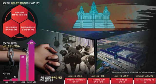 외교부에 따르면 우리나라 국민이 캄보디아에서 납치 또는 감금됐다는 신고는 올해 들어 8월 말까지 330건 접수되는 등 최근 한국인을 상대로 한 캄보디아 범죄 조직의 범행이 기승을 부리고 있다. 8월 캄보디아 캄폿주를 방문한 22세 한국인 관광객이 현지 범죄 조직에 납치돼 고문 끝에 숨지는 사건이 있었다. 캄보디아 현지 경찰은 사망 증명서에 사망 원인으로 ‘고문으로 인한 극심한 통증’을 적시했다. 9월에는 캄보디아 프놈펜을 방문한 50대 한국인 남성을 납치해 고문한 중국인 4명과 캄보디아인 1명이 현지 경찰에 체포된 바 있다.