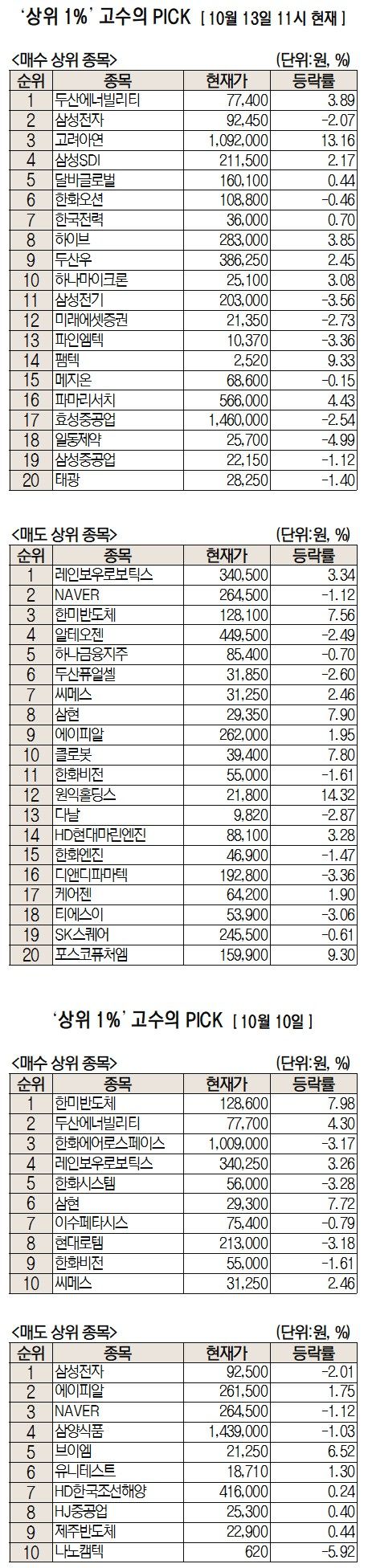 미래에셋증권은 자사 고객 중에서 지난 1개월간 수익률 상위 1% 투자자들의 매매 종목을 집계해 실시간·전일·최근 5일 기준으로 모바일트레이딩시스템(MTS) 상에서 공개하고 있다. 이 통계 데이터는 미래에셋증권의 의견과 무관한 단순 정보 안내이며 각각의 투자자 개인에게 맞는 투자 또는 수익 달성을 보장하지 않는다. 또 테마주 관련종목은 이상 급등락 가능성이 있으므로 유의해야 한다.
