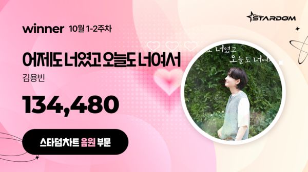김용빈 '어제도 너였고 오늘도 너여서'는 10월 1주차, 2주차 통합(집계기간 9월 29일~10월 12일) '스타덤 차트' 음원 부문 주간랭킹에서 1위를 차지했다. 9월 4주차 1위에 오른 이후 3주 연속 정상 등극이다.