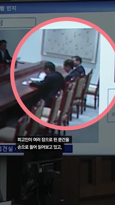 이후 16분 동안 한 전 총리와 이 전 장관은 단둘이 대접견실 테이블에 마주 앉아 각자 받은 문건을 주고받고, 문건을 손가락으로 짚어가며 서로 내용을 설명한다. 이 과정에 이 전 장관이 웃는 모습이 포착됐다.