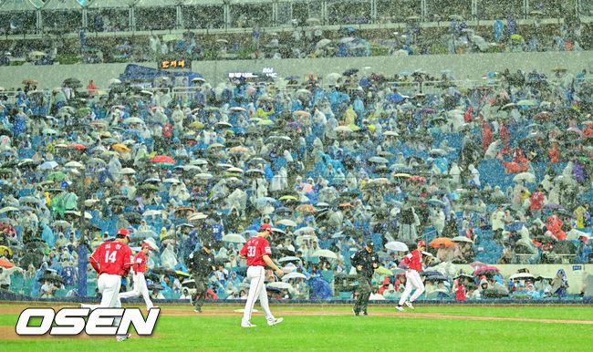 갑작스러운 폭우에 중단된 경기. 2025.10.13 / soul1014@osen.co.kr