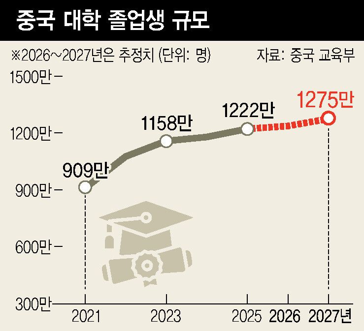 문제는 중국 대학 졸업자 규모가 당분간 계속 증가 추세를 보일 거라는 점이다. 중국에선 올해 사상 최대인 1200만명의 대학 졸업자가 고용 시장에 쏟아졌다. 중고등학교 진학 규모 등으로 추산할 때 2030년대까지 중국 대학 졸업자 수는 증가할 것으로 전망된다.