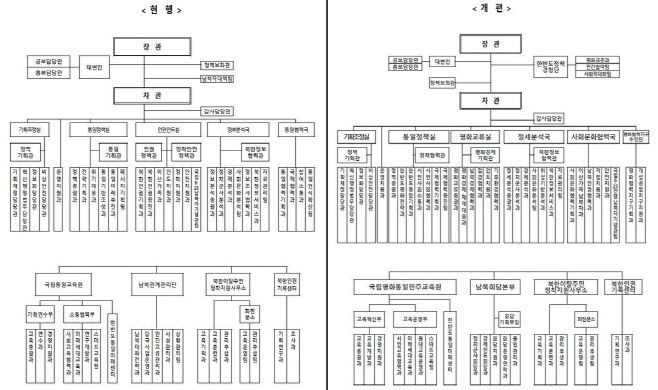 통일부 현재 조직도와 조직개편안. /통일부 제공 |