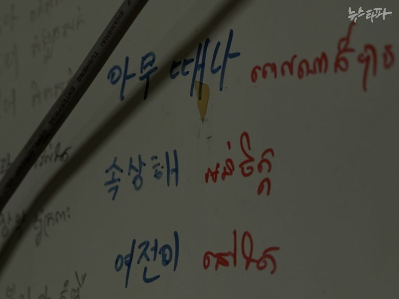 쑤(가명) 씨의 방 샌드위치 패널 벽에는 “아무 때나”, “속상해” 등의 단어와 문장이 한글과 캄보디아어로 적혀 있다. 그는 페이스북 등 sns를 통해 필요한 한국어를 공부한다고 말했다.
