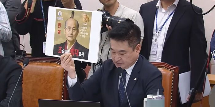 최 의원이 조 대법원장의 추천인으로 지목한 김XX가 정말 추천인이 맞는지, 김건희 여사의 계부는 확실한지, 정말 일본 황실, 일본 통일교와 밀접한 인연이 있는지, 이 모든 게 사실이라면 조 대법원장을 친일이라 불러도 될지, 최 의원은 중간 연결고리는 생략하고 바로 친일을 주장했습니다. 다만 '친일'의 증거로 두 가지 재판 사례를 들었습니다. 2023년 일본 사찰의 부석사 금동관음보살좌상 반환 소송에서 일본 사찰 승소 사례와 2023~2024년 일제 강제동원 피해자들의 일본 전범 기업들을 상대로 한 추가 소송 기각 사례입니다. 그러면서 최 의원은 질의 도중 팻말을 하나 들어 보입니다.