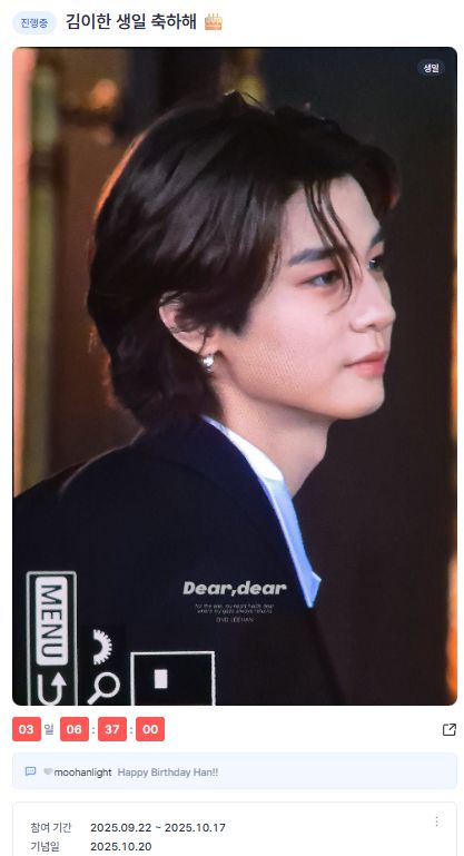 참여 기간은 지난 9월 22일부터 오는 17일까지이며, 기념일은 10월 20일이다. 팬들은 다가오는 생일과 컴백을 함께 축하하며 이한의 새로운 행보를 응원하고 있다.