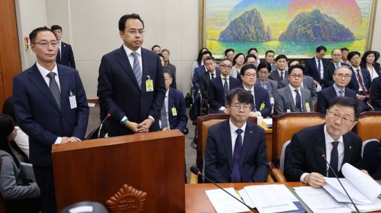 김명규 쿠팡이츠 대표(왼쪽)과 김범석 우아한형제들 대표가 14일 국회에서 열린 공정거래위원회, 개인정보보호위원회 등에 대한 정무위원회 국정감사에서 의원 질의를 듣고 있다. 김현민 기자 |