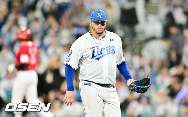5회초 2사 2루 SSG 대타 류효승을 외야플라이로 잡으며 위기 탈출한 삼성 후라도가 더그아웃으로 들어가고 있다. 2025.10.14 / soul1014@osen.co.kr
