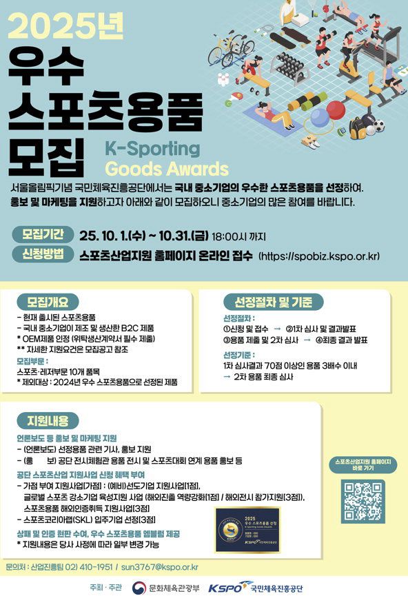 서울올림픽기념국민체육진흥공단(이사장 하형주)이 국내 중소기업의 우수한 스포츠용품을 발굴·지원하기 위한 ‘2025년 우수 스포츠용품 선정(K-Sporting Goods Awards)’ 사업 참가 기업을 모집한다.