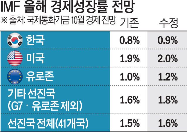 한국·미국·영국·일본 등 41개국이 포함된 선진국 그룹의 올해 성장률은 7월 전망 대비 0.1%p 상향된 1.6%로 수정됐다. 이들 그룹의 내년 성장률은 기존 전망과 같은 1.6%로 예측됐다.