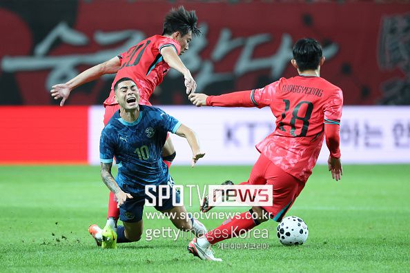 홍명보 감독은 20분에 다시 변화를 가져갔다. 황인범과 엄지성 대신 이재성과 원두재가 들어갔다.