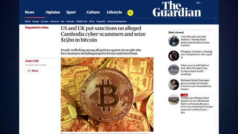 영국 일간 가디언지는 현지 시간 14일자 "미국과 영국, 캄보디아 사이버 사기범을 제재하고 150억 달러 비트코인을 압류한다"라는 제목의 기사에서 이 같은 내용을 보도했습니다.
