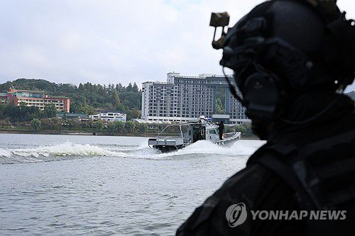 (경주=연합뉴스) 손대성 기자 = 해양경찰이 15일 경북 경주 보문호에 특수기동정을 배치해 기동 연습을 하고 있다.