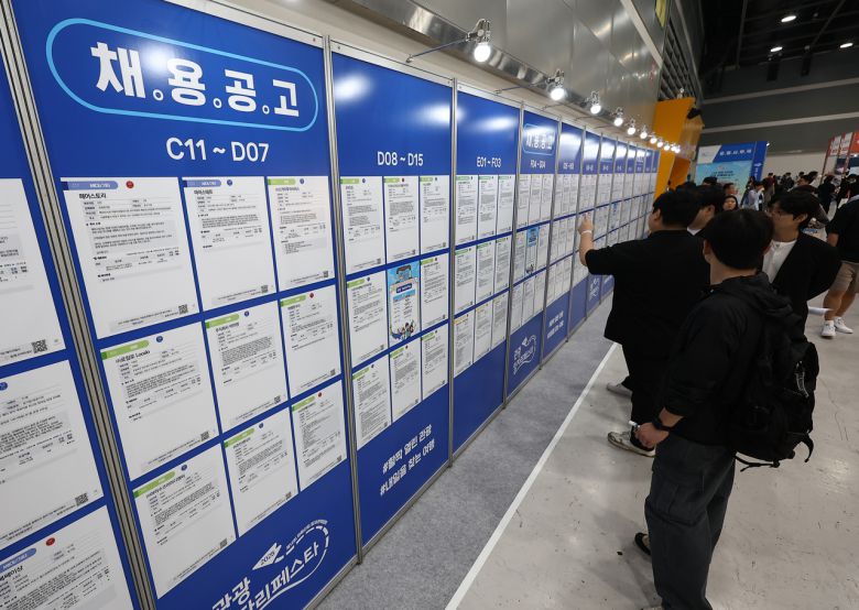 지난달 30일 서울 서초구 aT센터에서 열린 ‘2025 관광 일자리 페스타’에서 구직자들이 채용공고를 확인하고 있다.[연합]