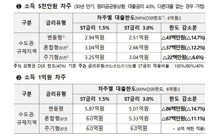 이에 따라 차주들의 대출한도도 축소된다. 5000만원 연봉자의 경우 수도권 주택담보대출(주담대) 한도가 기존보다 4300만원 줄고, 1억원 연봉자는 8600만원의 한도가 감소된다.