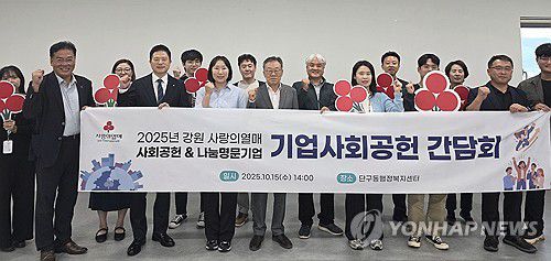 (원주=연합뉴스) 15일 오후 강원 원주시 단구동행정복지센터에서 강원사회복지공동모금회(강원사랑의열매)가 관내 기업 관계자들과 2025년 기업사회공헌 간담회를 하고 기념 촬영을 하고 있다.