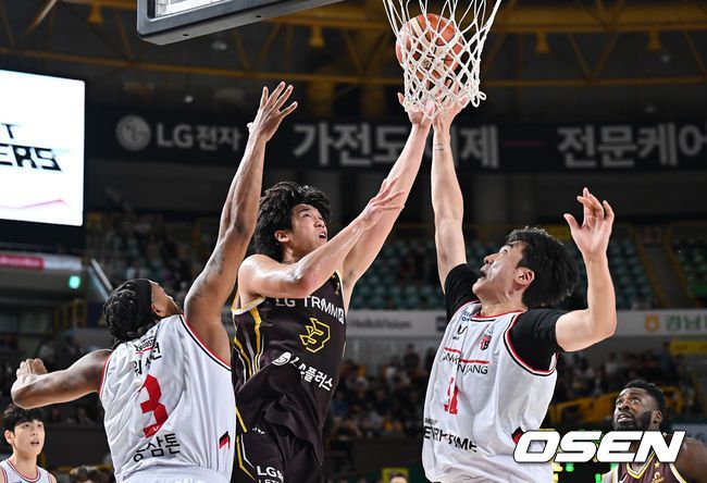 [OSEN=창원, 이석우 기자] 15일 창원 체육관에서 2025-2026 LG전자 프로농구 창원 LG와 안양 정관장의 경기가 열렸다. LG의 외곽을 책임지는 유기상이 2번째 4경기 연속 3점슛 5개+ 성공 기록에 도전한다. 창원 LG 칼 타마요가 안양 정관장 브라이스 워싱턴과 한승희의 마크를 피해 골밑슛을 시도하고 있다. 2025.10.15 / foto0307@osen.co.kr 이 기사의 카테고리는 언론사의 분류를 따릅니다.0공유하기
