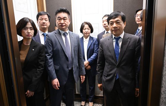 추미애 국회 법제사법위원장(가운데)과 더불어민주당, 조국혁신당, 무소속 법사위 위원들이 15일 서울 서초구 대법원에서 열린 현장 국정감사 도중 대법관의 ‘대선후보 파기환송 판결 과정 전산 로그 기록’을 검증하겠다며 이동하고 있다. [사진 국회사진기자단]