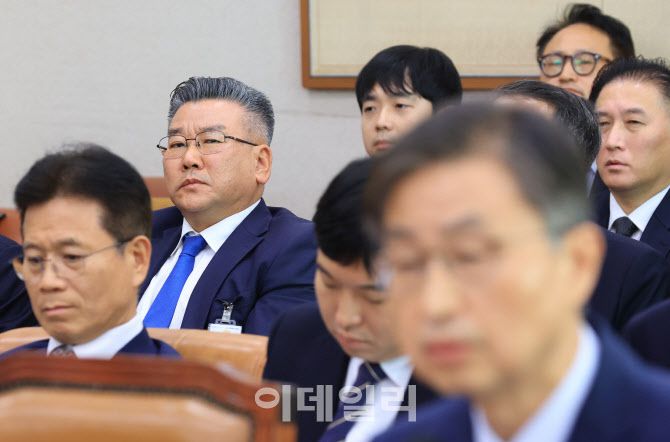[이데일리 노진환 기자] 유병호 감사원 감사위원이 16일 서울 여의도 국회 법제사법위원회에서 열린 감사원 등에 대한 국정감사에 출석, 질의에 답변하는 최재해 감사원장을 바라보고 있다.