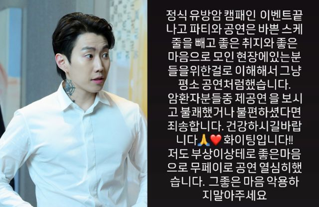 박재범은 자신의 사회관계망서비스(SNS)를 통해 “정식 유방암 캠페인 종료 후 이어진 파티 공연이었다”며 “좋은 취지로 모인 자리에서 평소처럼 무대를 했다”고 해명했다. 이어 “암환자분 중 제 공연을 보고 불쾌했거나 불편하셨다면 죄송하다”며 “부상 중이었지만 무페이로 참여했다. 그 마음을 악용하지 말아달라”고 덧붙였다.