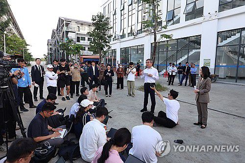 (프놈펜=연합뉴스) 서대연 기자 = 캄보디아로 파견된 정부 합동대응팀 단장인 김진아 외교부2차관과 박성주 경찰청 국가수사본부장이 16일(현지시간) 캄보디아 프놈펜 인근 범죄단지인 태자단지 현장점검을 마친 뒤 브리핑하고 있다. 2025.10.16