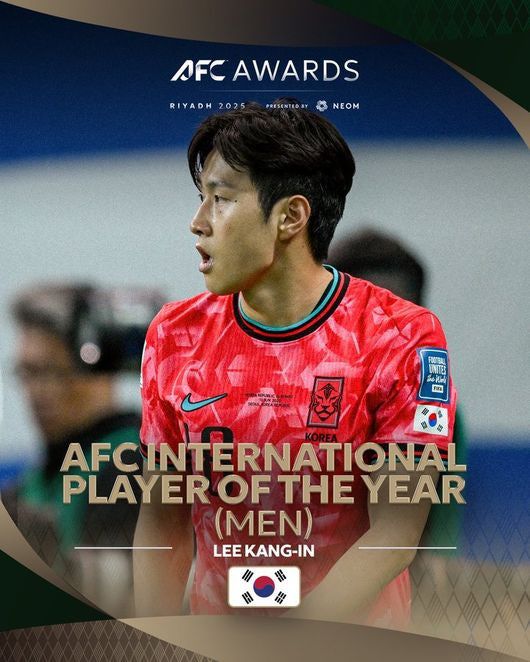 이강인은 17일(한국시간) 사우디아라비아 리야드에 위치한 킹 파하드 문화센터에서 열린 AFC 어워드 리야드 2025에서 남자 아시아 올해의 국제 선수로 선정됐다. 현재 PSG에서 시즌을 보내고 있는 이강인은 행사에 참석하지 못했다.