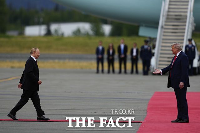 도널드 트럼프 미국 대통령이 16일(현지시간) 블라디미르 푸틴 러시아 대통령과 통화했다. 두 정상은 2주 내로 헝가리 부다페스트에서 정상회담을 가질 것으로 예상된다. 사진은 지난 8월 15일 미국 알래스카에서 만난 트럼프 대통령과 푸틴 대통령. /AP.뉴시스
