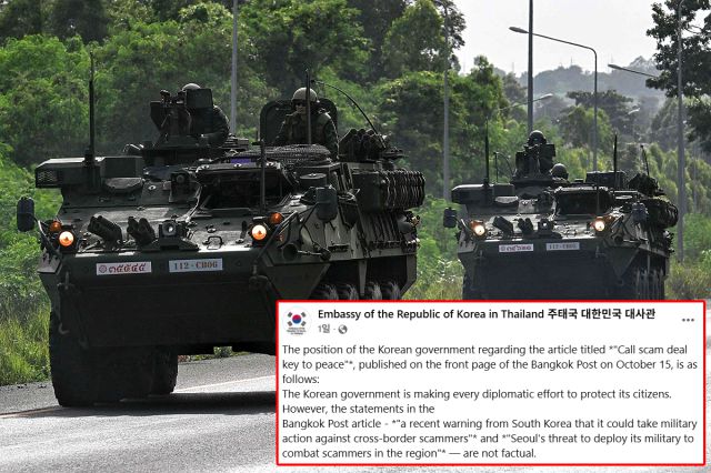 대사관은 또 방콕포스트 1면에 실린 기사 중 “국경을 넘는 사기꾼에 대해 군사적 행동을 할 수 있다는 한국의 경고”, “사기꾼들을 소탕하기 위해 군대를 배치하겠다는 서울의 위협” 등의 표현은 사실과 다르다고 강조했다.