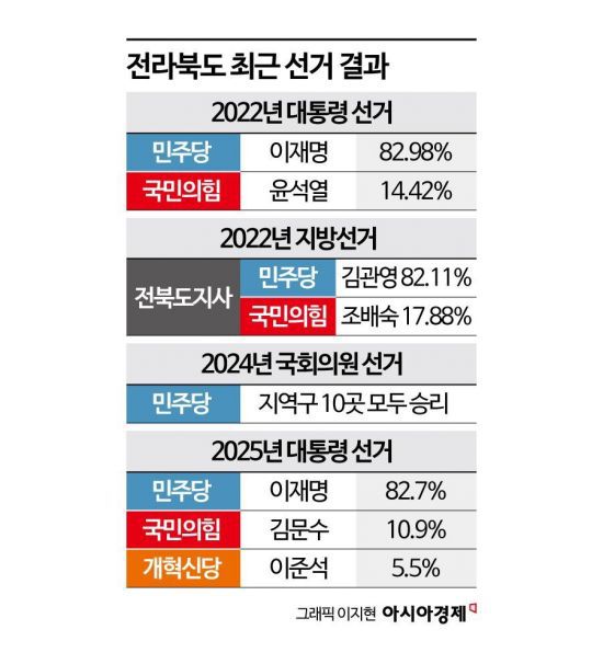 2022년 대통령 선거에서 이재명 민주당 후보는 82.98%를 득표했다. 윤석열 국민의힘 후보는 14.42%에 그쳤다. 그 해 치른 제8회 지방선거 결과도 비슷했다. 김관영 민주당 후보가 82.11%, 조배숙 국민의힘 후보는 17.88%를 득표했다. 국민의당에서 같이 의정 활동을 했던 두 사람이 정치 노선을 달리해 맞붙었던 선거였다. 2024년에 국회의원 선거에서도 지역구 10곳에서 모두 민주당 후보가 승리했다. 이런 흐름은 지난 6.3 대선에서도 그대로 이어졌다. 이재명 민주당 후보가 82.7%, 국민의힘 김문수 후보 10.9%, 개혁신당 이준석 후보 5.5% 득표를 기록했다.