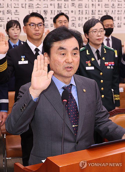 (서울=연합뉴스) 박동주 기자 = 안규백 국방부 장관이 17일 서울 여의도 국회 법제사법위원회에서 열린 군사법원 등에 대한 국정감사에서 선서하고 있다. 2025.10.17