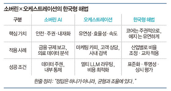 전문가들은 공통적으로 정답을 고르는 시험이 아니라, 맥락을 설계하는 시간이라고 조언한다. 지금 한국 기업들이 마주한 선택은 시험지가 아니라 지도를 펴는 일에 가깝기 때문이다. 인공지능 전략을 두고 흔히 ‘소버린 AI’와 ‘오케스트레이션’이라는 두 갈래로 이야기하지만, 현실은 둘 중 하나를 고르는 문제가 아니다. 오히려 산업의 특성과 규제 환경, 보유한 데이터의 성격에 맞춰 비율을 조정하고 교차시키는 방식이 더 적합하다.