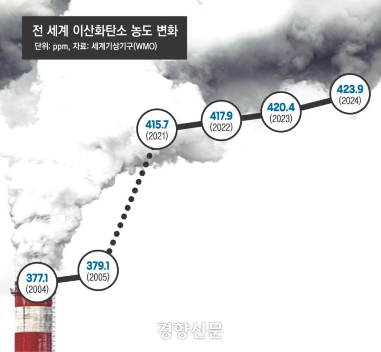 세계기상기구(WMO)가 지난 16일 발간한 ‘온실가스 연보’에 따르면 지난해 이산화탄소 농도는 423.9PPM으로 2023년보다 3.5PPM 증가해 최고치를 기록했다. 1957년 관측 시작이래 가장 큰 증가폭이다. 메탄·아산화질소 농도도 1942ppb와 338.0ppb로 역대 1위였다.