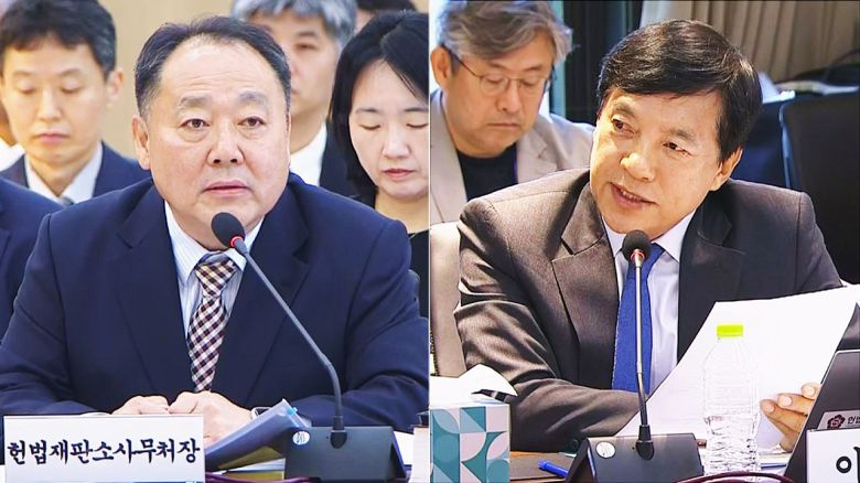 헌법재판소에서 진행된 법사위 국정감사에서는 국민의힘에 대한 '위헌 정당 해산 심판'이 쟁점이 됐습니다. 대다수의 국민의힘 의원들이 계엄 해제 표결에 참여하지 않았고, 용산 관저 앞에서 체포를 막았기 때문에 '위헌 정당'이라는 건데, 헌재 측은 즉답을 피했습니다.