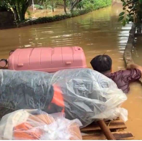 영상 속에는 아버지가 목까지 잠긴 흙탕물 속에서 캐리어 등이 실린 대나무 뗏목을 끌며 나아가는 모습이 담겼다.
