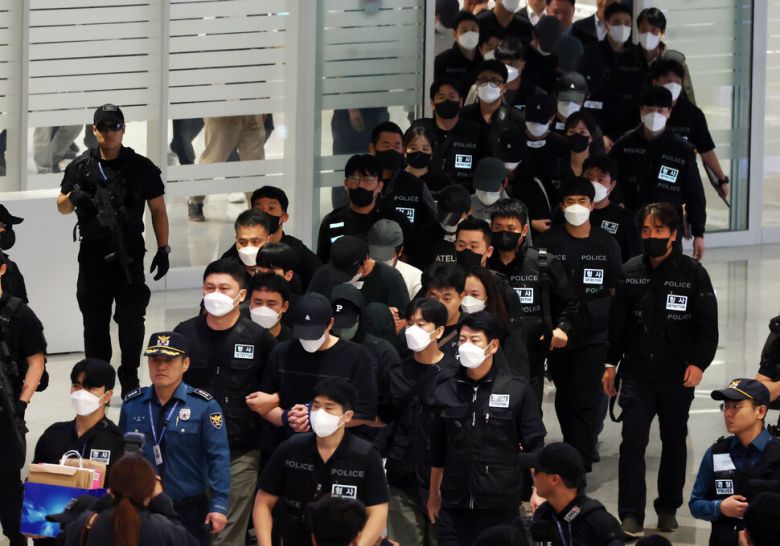 캄보디아 당국에 구금됐던 한국인 64명이 18일 아침 9시54분께 인천국제공항 입국장을 나와 지역 경찰청과 경찰서로 압송됐다. 단일국가 기준으로는 역대 최다 인원을 대상으로 한 호송 작전이 완료된 셈이다.