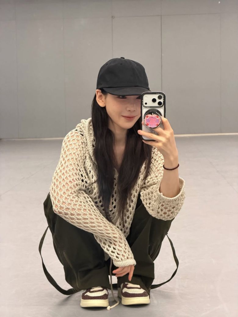 사진 속 태연은 깔끔한 공간에서 거울 셀카를 찍고 있다. 태연은 베이지색의 루즈핏 니트 후드 카디건을 입고 하의로 카키색 계열의 와이드 팬츠를 매치해 활동적이면서도 스타일리시한 룩을 연출했다.
