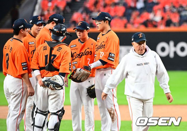 선발 폰세는 6이닝 7피안타(1피홈런) 1볼넷 8탈삼진 6실점(5자책)으로 부진했으나 승리 투수가 됐다. 문동주가 7회 구원투수로 등판해 올 시즌 최고 구속인 161.6km를 던지며 2이닝 1피안타 4탈삼진 무실점으로 호투했다. 마무리 김서현은 9회 등판해 홈런 등 2점을 허용하고 1사 1루에서 교체됐다. 김범수가 세이브를 기록했다.