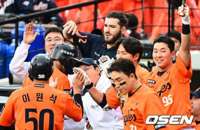 [OSEN=대전, 지형준 기자] 18일 오후 대전 한화생명볼파크에서 2025 신한 SOL Bank KBO리그 포스트시즌 플레이오프 1차전 한화 이글스와 삼성 라이온즈의 경기가 열렸다.한화는 폰세, 삼성은 가라비토를 선발 투수로 내세웠다.6회말 2사 2,3루에서 한화 채은성이 역전 2타점 적시타를 날리자 손아섭이 리베라토, 이원석을 맞이하며 기뻐하고 있다. 2025.10.18 /jpnews@osen.co.kr
