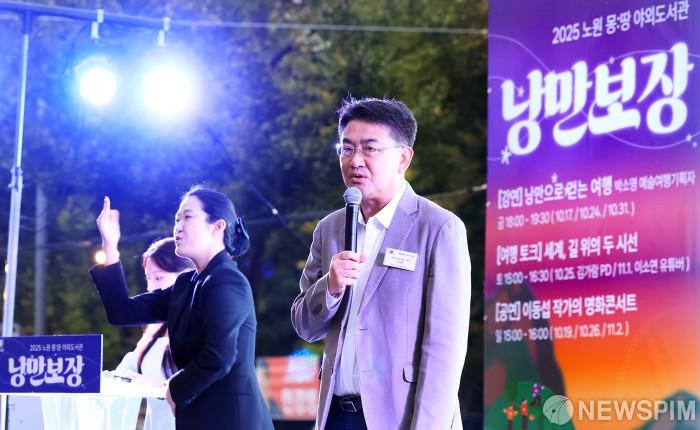 [서울=뉴스핌] 양윤모 기자 = 오승록 노원구청장이 18일 오후 서울 노원구 하계2동 경춘선숲길 일대에서 열린 ‘2025 노원 북페스티벌’ 개막식에 참석해 인사말을 하고 있다.   노원 북페스티벌은 ‘몽:땅 야외도서관’이라는 컨셉으로 책과 예술, 그리고 휴식이 어우러진 도심 속 문화축제다. ‘꿈(夢)을 담은 땅(場) 위에서 모두에게 낭만을 보장하겠다’는 의미를 담아 기획됐으며 11월 2일까지 매주 금·토·일 총 9일간 경춘선숲길 일대에서 진행된다. [사진=노원구청] 2025.10.18 yym58@newspim.com