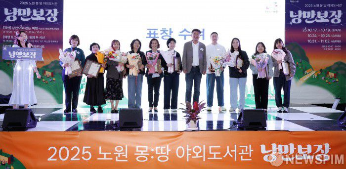 [서울=뉴스핌] 양윤모 기자 = 오승록 노원구청장이 18일 오후 서울 노원구 하계2동 경춘선숲길 일대에서 열린 ‘2025 노원 북페스티벌’ 개막식에서 도서관 유공자들에게 표창을 수여후 기념촬영을 하고 있다. 노원 북페스티벌은 ‘몽:땅 야외도서관’이라는 컨셉으로 책과 예술, 그리고 휴식이 어우러진 도심 속 문화축제다. ‘꿈(夢)을 담은 땅(場) 위에서 모두에게 낭만을 보장하겠다’는 의미를 담아 기획됐으며 11월 2일까지 매주 금·토·일 총 9일간 경춘선숲길 일대에서 진행된다. [사진=노원구청] 2025.10.18 yym58@newspim.com |