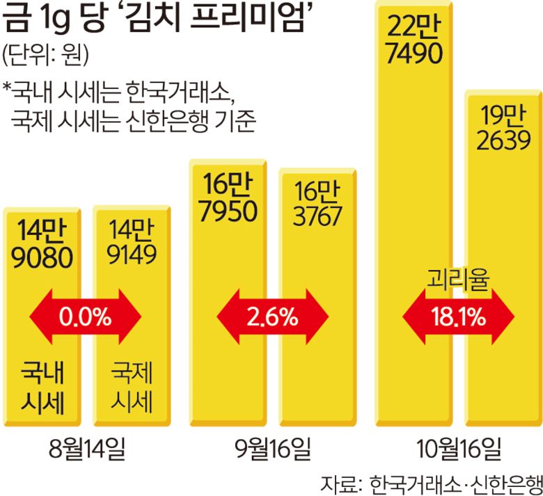 한국거래소 금 시세는 이날 금 1g당 22만7490원에 형성됐다. 반면 로이터에서 제공하는 국제 금 시세에 환율을 반영하는 신한은행 금 시세는 이보다 18.1% 낮은 19만2639원이다. 이처럼 국내 시장에서 금 실물 수요가 급증하면 국내·국제 시세 사이에 괴리가 생기면서 김치프리미엄이 발생할 수 있다.