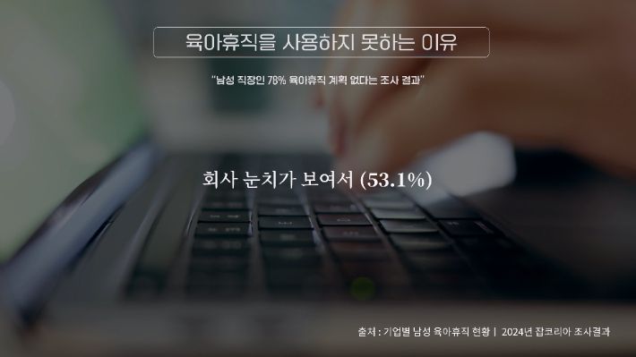 잡코리아가 2024년도 조사한 결과에 따르면 '남성 직장인 78%가 육아휴직 계획이 없다'고 답했습니다. 이유는 회사 눈치가 보여서(53.1%), 경제적 부담(31.5%), 승진·평가 불이익 우려(10.3%) 등으로 나타났는데요. 육아휴직을 사용했던 남성 중 71%가 실제로 눈치를 봤다고 응답했고 85%는 인사고과 불이익이 걱정돼서 쉽게 결정을 못 낸다는 조사도 있습니다.