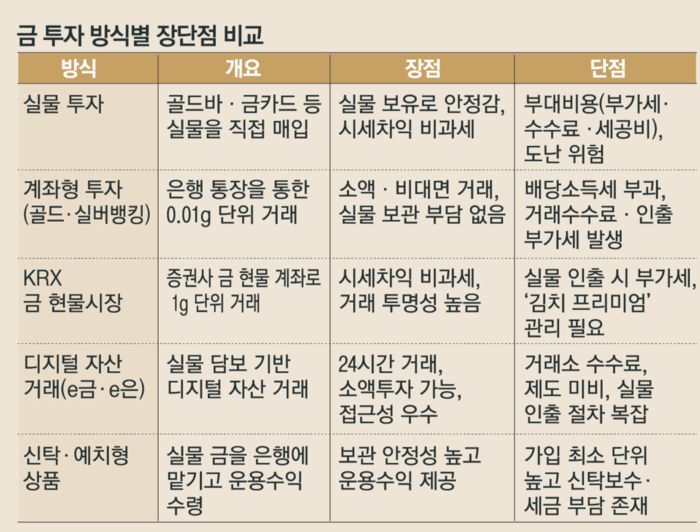 최근에는 신탁·예치형 상품도 등장했다. 실물 금을 금융회사에 맡기면 운용을 대신해주는 구조로, 보관 안정성이 높다는 장점이 있다. 하지만 신탁 보수와 과세 방식(기타소득세 등)을 사전에 확인해야 불필요한 비용을 피할 수 있다.