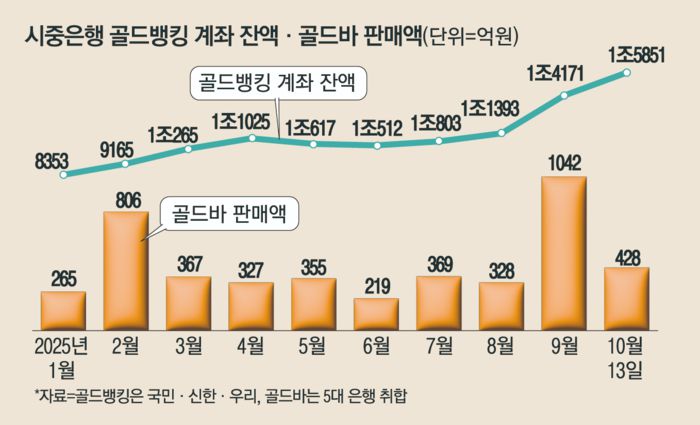실물 거래도 뜨겁다. 지난 13일 기준 5대 시중은행의 올해 골드바 누적 판매액은 4506억원으로, 이미 지난해 연간 판매액(1654억원)의 약 세 배를 기록했다. 골드바 판매는 지난 9월에만 1042억원을 기록했는데, 이는 전월(328억 원) 대비 3배 넘게 증가한 수준이다.