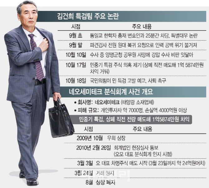 네오세미테크는 2009년 10월 우회 상장했으나 회계법인의 감사의견 거절로 2010년 3월 24일 거래가 정지됐고, 같은 해 8월 상장폐지됐다. 이 과정에서 개인 투자자 약 7000명이 4000억원이 넘는 손해를 입었다. 분식회계를 알지 못한 일반 투자자들이 막대한 피해를 본 반면, 민 특검은 거래정지 직전 주식을 처분해 성공적인 ‘엑시트’를 한 것이다.