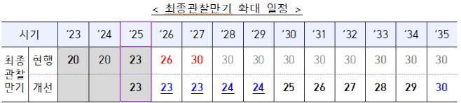 19일 금융당국은 최종관찰만기를 내년부터 2035년까지 총 10년에 걸쳐 확대할 방침을 발표했다. 구체적으로는 2026~2027년에는 현행 최종관찰만기 23년 수준을 유지하고, 2028~2029년에는 24년으로 확대, 그 이후로는 매년 1년씩 확대에 나선다. 2035년에는 최종적으로 최종관찰만기 30년이 적용된다.