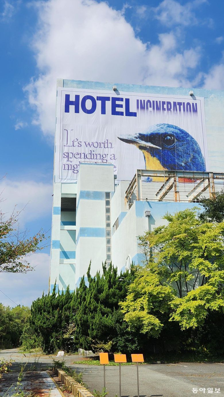13일 오후 부산 사하구 다대소각장. 오래돼 칠이 벗겨진 벽면에 파란 직박구리가 바다를 응시하는 모습의 대형 현수막이 걸려 있었다. ‘HOTEL INCINERATION(호텔 소각)’이라는 문구가 적혀 있었다. 설치미술가 조형섭 작가의 ‘장기 초현실’이라는 작품이다. 조 작가는 ‘2025 부산바다미술제’ 전시를 위해 소각장을 찾았다가 이곳에 둥지를 튼 새를 보고 영감을 받아 이 작품을 만들었다고 한다. 현장을 안내하던 부산바다미술제 관계자는 “도시의 폐기물을 태웠던 소각장은 지금은 폐허로 남아 있지만, 앞으로 호텔 같은 해양관광 시설로 바뀔 예정”이라며 “작가는 이곳에서 살아가는 새를 통해 다대포의 과거와 현재, 미래를 한눈에 보여주고 관람객이 스스로 고민하는 시간을 갖게 하려 한 것”이라고 설명했다.