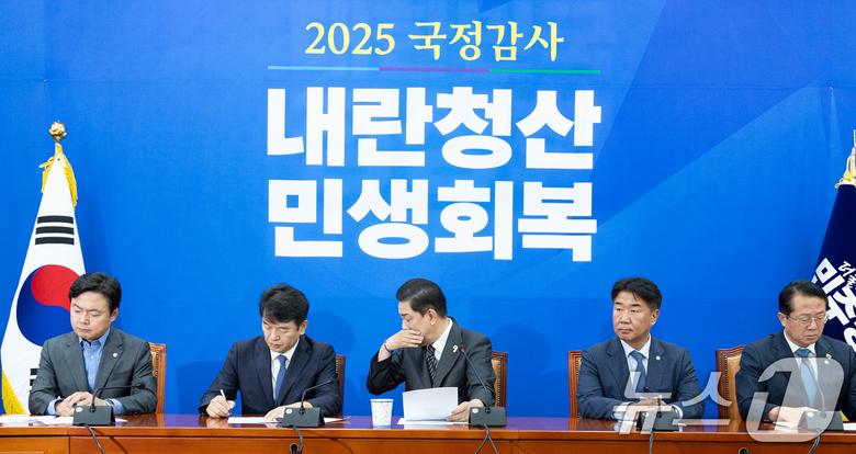 김병기 더불어민주당 원내대표가 19일 서울 여의도 국회에서 열린 국정감사 기자간담회에서 기침하고 있다. 2025.10.19/뉴스1 ⓒ News1 이승배 기자