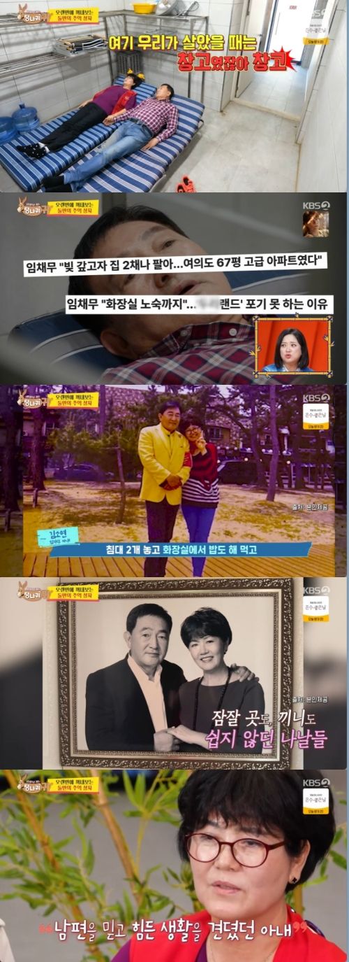이후 여자 화장실에 간이침대 2개를 놓고 나란히 누운 임채무와 아내는 이곳에서 잤던 과거를 회상했다. 아내는 “금전적인 문제로 화장실 생활을 하게 됐는데 침대 2개 놓고 화장실에서 밥도 해 먹었어요. 진심으로 아이들을 사랑했기에 저도 그 마음을 알고 같이 있었다”고 인터뷰에서 밝혔다.