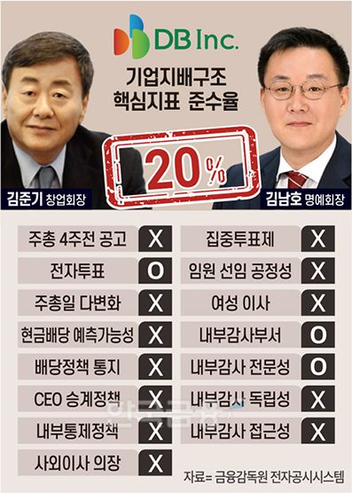 DB 기업지배구조보고서에 따르면, 이 회사는 지배구조 핵심지표 15개 중 3개만 준수했다. 준수율은 20%에 그친다.